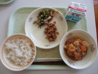 今日の給食は、「うめごはん」「小魚のいそべあげ」「大豆とひじきのサラダ」「カレ...