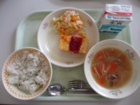 今日の給食は、「パセリライス」「チーズ入りポテトオムレツ」「ハニーサラダ」「オ...