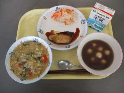 12日から3学期の給食が始まりました。1月7日は「七草がゆ」、1月11日は「鏡開き」です。その2日間にちなんで、七草ぞうすいとお汁粉を出しました。1年の幸せを願った行事食です。