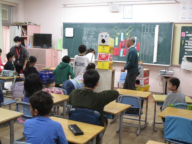 節分の意味について学習した後、自分の中にある鬼について考え、その鬼を退治するために手作りの豆をまきました。最後にひょっこり本物の鬼が現れました。