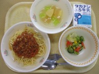 ◆牛乳◆スパゲッティ ミートソース◆バジルサラダ◆ゼリーポンチ 今日は桃ゼリー、...