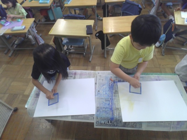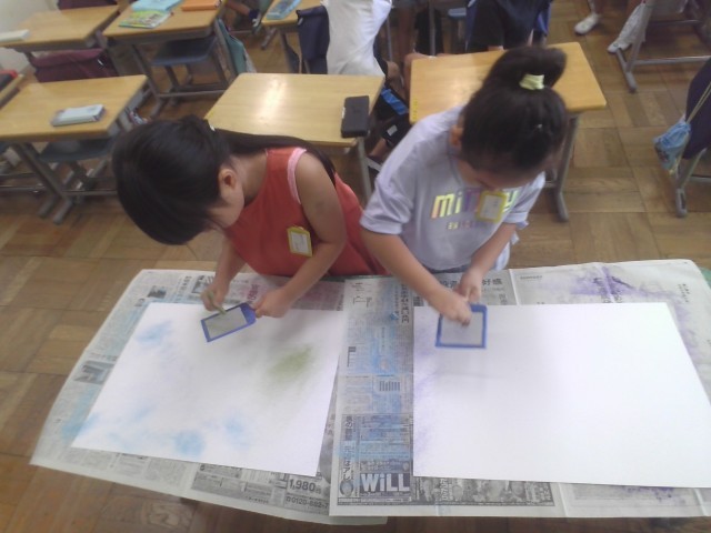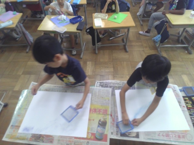 背景に色をつけるために、パステルをつかいました。パステルを金網で削り、手で伸ばすとふんわり色が広がってつきます。子どもたちは、初めて使う画材にとても喜び楽しく活動していました。