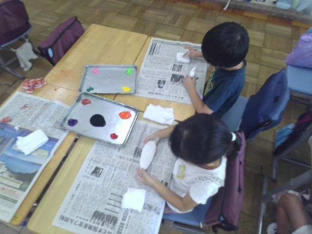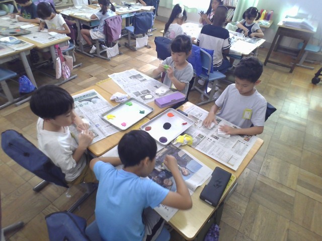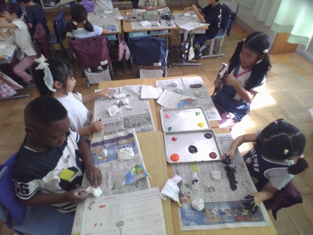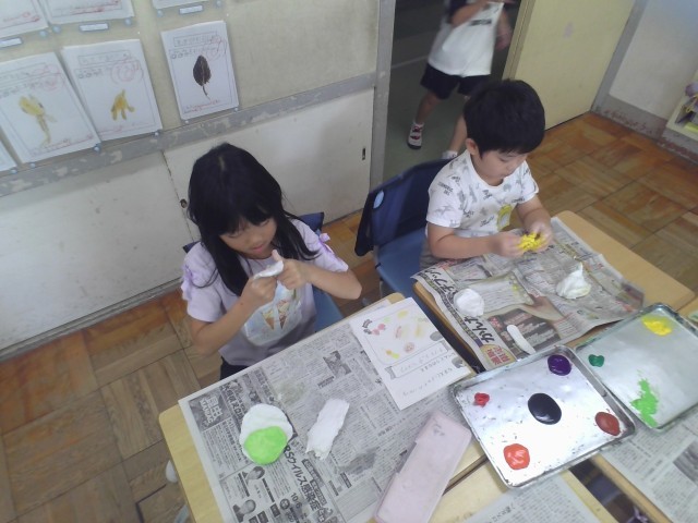 展覧会に向けて作品作りを熱心に取り組んでいます。紙粘土に絵の具を練り込む感触を楽しみながら、思い思いに制作していました。