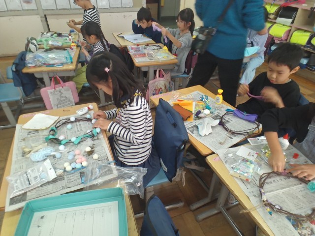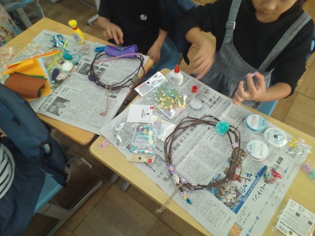 お家から持ってきた飾りを好きなところにつけて、オリジナルリースの完成です!