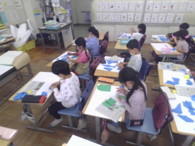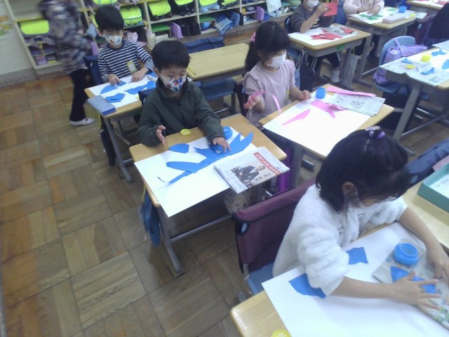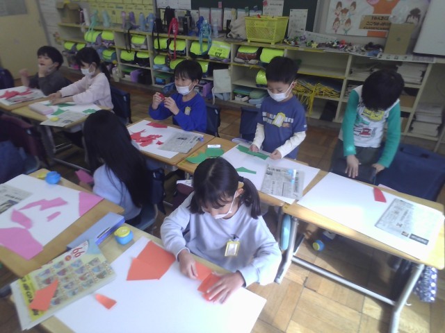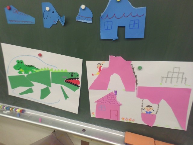 画用紙を適当にちぎり、そのできた紙の形から何か別の物に見立てていく学習です。「ここがとがっているから、ソフトクリームみたい。」「組み合わせるとお家の形になるよ。」とどんどん絵が生まれてきます。子供たちの想像力は無限大です!