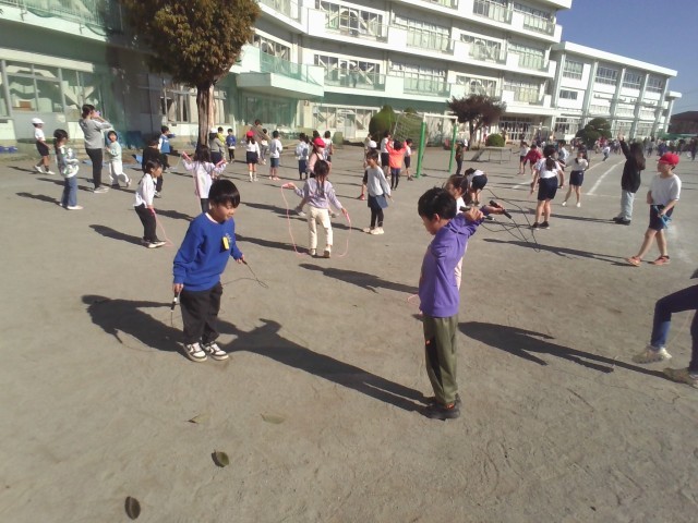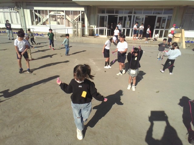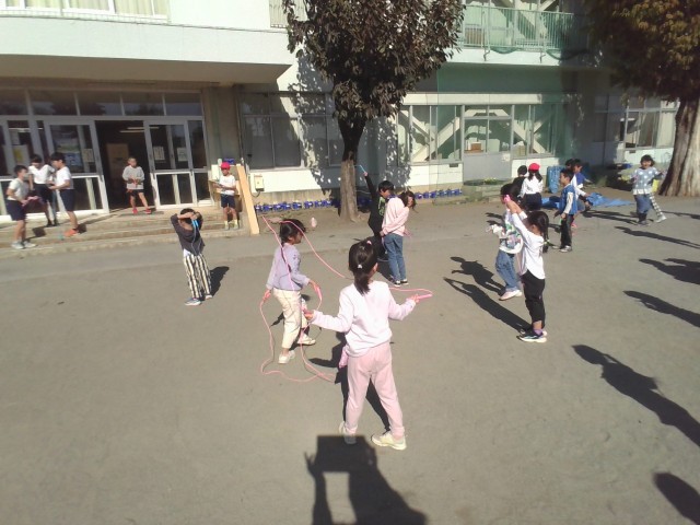 縄跳び週間では、中休みに音楽に合わせて全校で縄跳びを跳びます。最初は、1.2回跳ぶのがやっとの子もどんどん上手になり、いろいろな技にチャレンジできるようになりました。「継続は力なり」を実感した1週間でした。