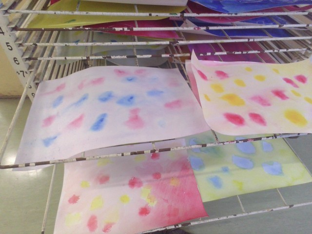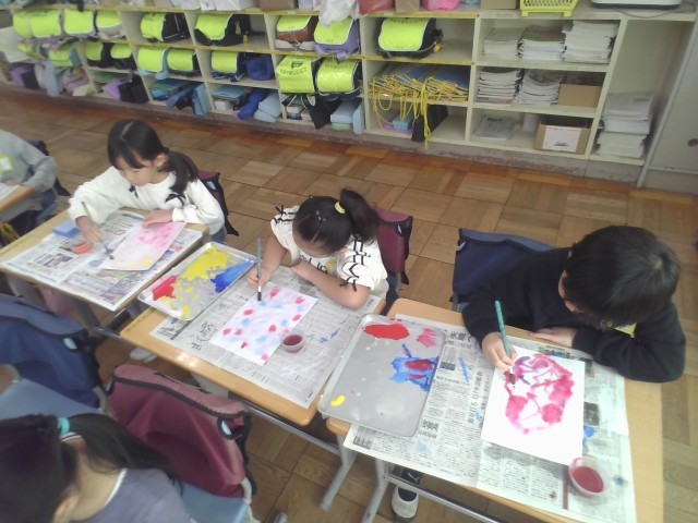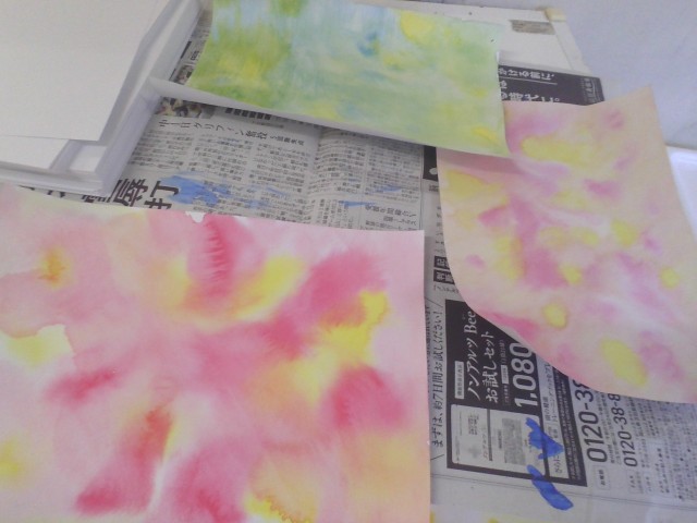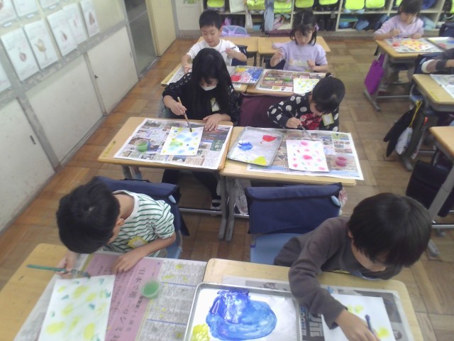 絵の具を使って、はじき絵とにじみ絵を描きました。はじき絵は、白いクレヨンで絵を描きそこに絵の具を塗ると絵が浮き上がるものです。はじき絵は、水で濡らした紙に絵の具を垂らすと、じわっと広がる様子を楽しめます。次回は、これらを使って工作していきます。