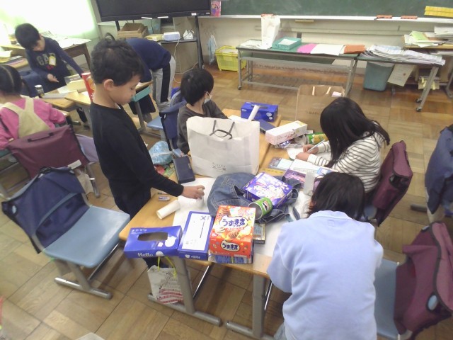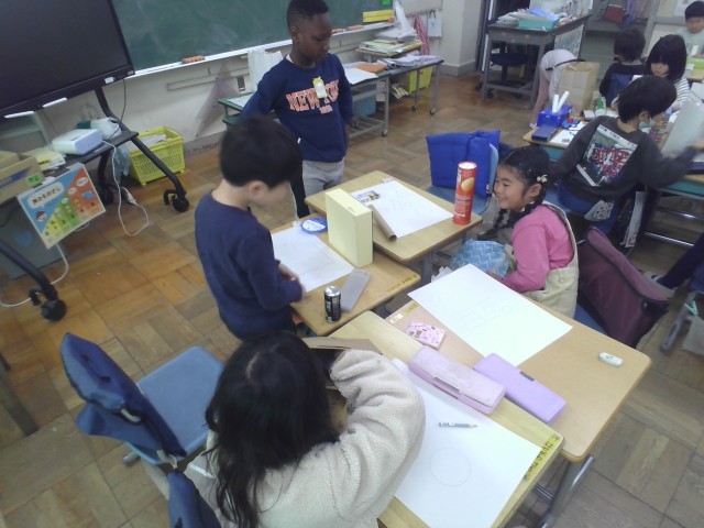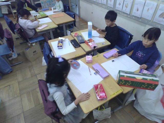 箱を使って、紙に形を写し取りました。どんな形になるか予想しながら取り組み、写し取った形を使って絵を描きました。保護者の皆様、箱のご準備ありがとうございました。
