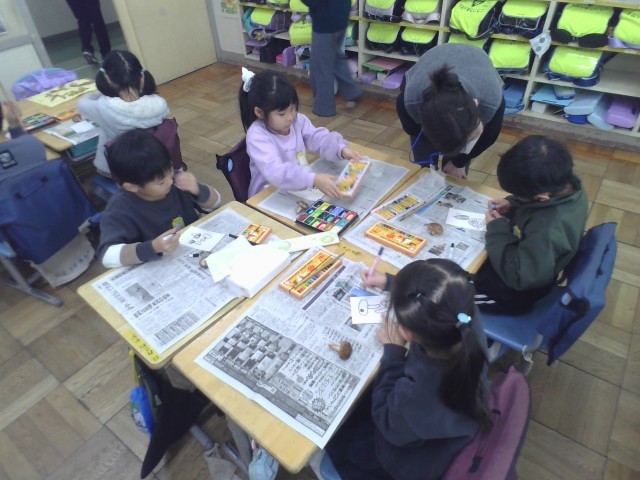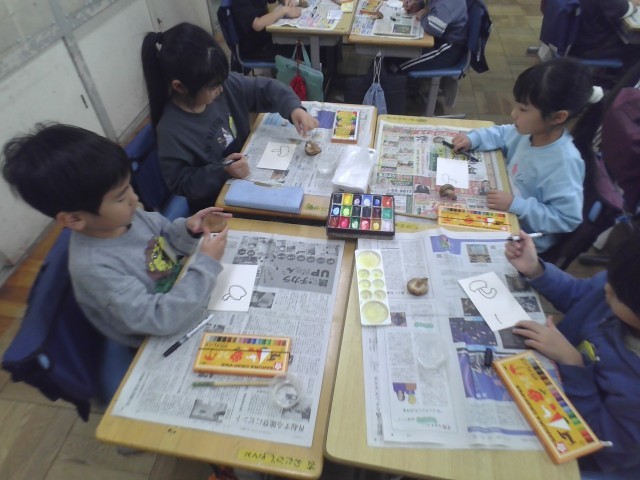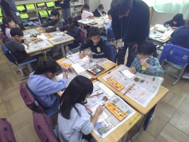 地域に住む絵手紙の先生が来校しました。今年度は、きのこをモチーフに絵手紙を描きました。絵手紙教室で使われている顔彩をお借りして、楽しく学習することができました。