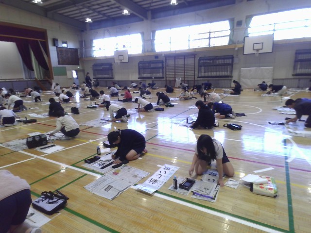 書き初め会の様子です。集中した空気がこちらにも伝わってきました。