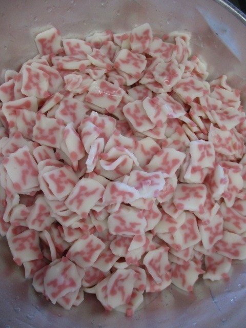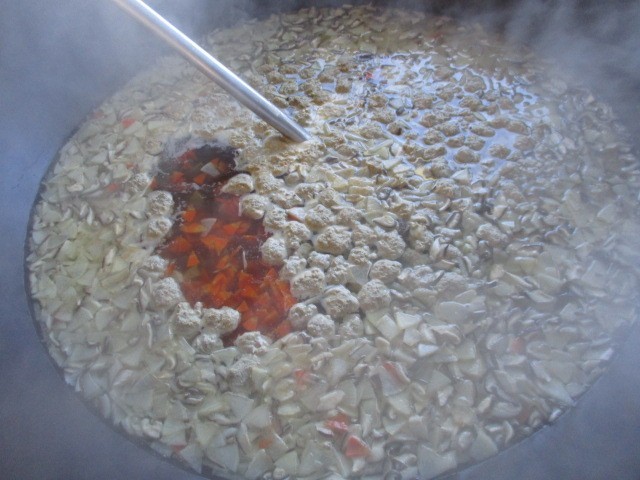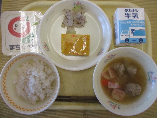 今日の汁物にはいわしのつみれと鬼の形のかまぼこが入っています。
