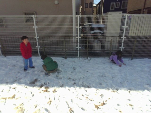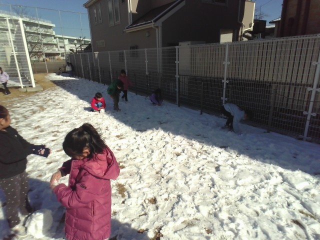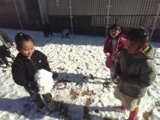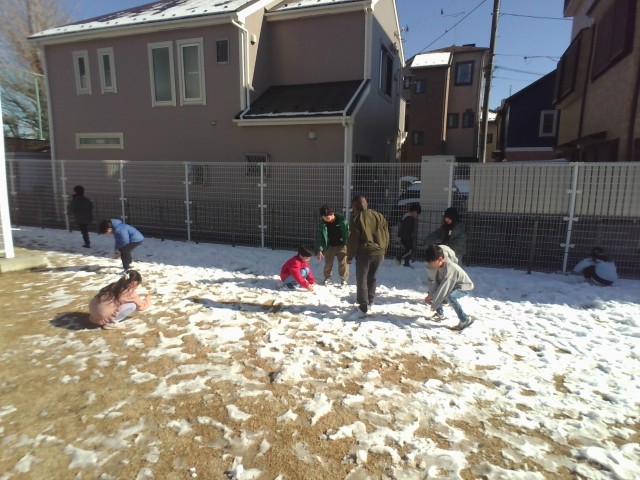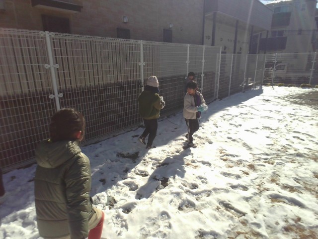 休みの間に降り積もった雪で遊びました。手形をつけたり雪玉を作ったり、足で雪の感触を確かめたり…遊び方は様々です。遊ぶ中で「日が当たっているところは、シャーベットみたい。」「日陰のところは、雪がたくさん残っていて硬い。」など、理科の学習に繋がるような気づきもありました。