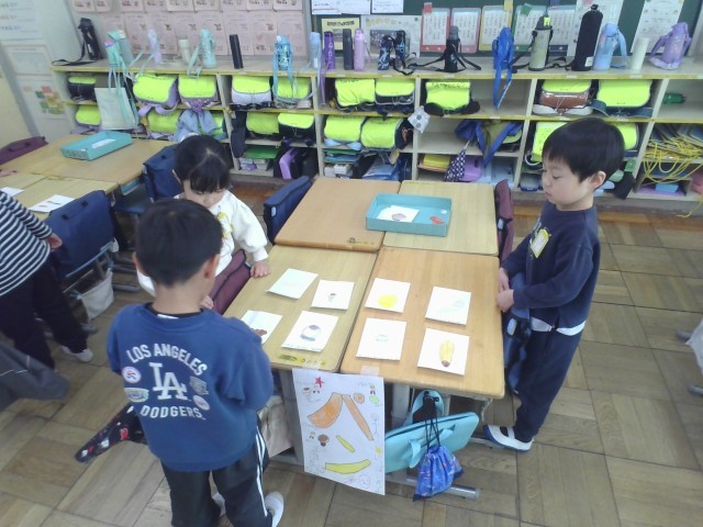 ものの名まえの学習のまとめとしてお店屋さんごっこをしました。おすすめの商品を紹介したりお金の計算をしたりするお店屋さんも、持っているお金の中で上手にお買い物をするお客さんも、どちらも楽しく活動することができました。他のクラスのお店も行くことができて嬉しそうでした。作ったお金と商品を持ち帰りました。お家でも遊んでみてください。
