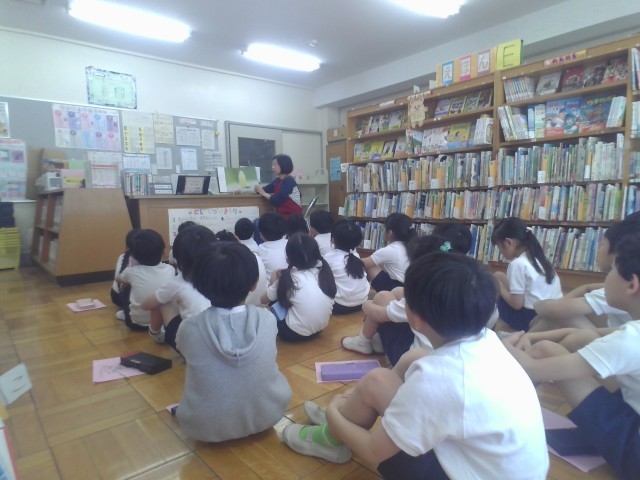司書の先生が春にぴったりな「生まれたよ、モンシロチョウ」「かぶとむしランドセル」を読み聞かせしてくれました。話の聞き方がとても上手だと司書の先生に褒められました。
