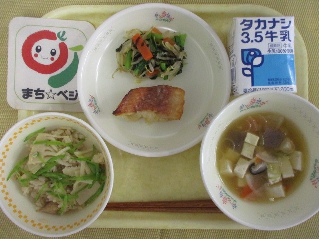たけのこごはんには、生のたけのこを給食室でゆでたものを使いました。