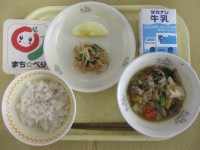 今日はみなさんの大好きな揚げパンです。揚げパンは、昭和27年ごろに東京都大田区の小学校で誕生したといわれています。当時の調理員さんが、時間がたって固くなったパンをおいしく食べられるようにと考えられました。今日も残さず食べましょう。