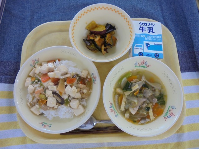 豆腐とえびの旨煮丼 秋野菜の揚げびたし きのこ汁 牛乳