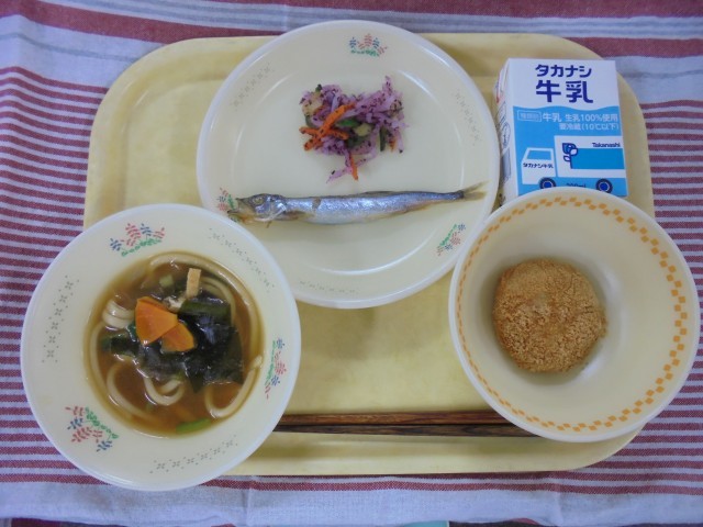 わかめうどん 焼きししゃも ゆかり和え お月見だんご 牛乳