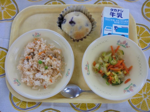 サーモンとキャロットのピラフ さっぱりサラダ ブルーベリーマフィン 牛乳