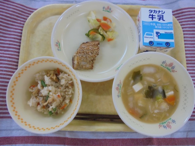 こぎつねごはん ほっけのみりん焼き 甘酢和え さつまいものみそ汁 牛乳