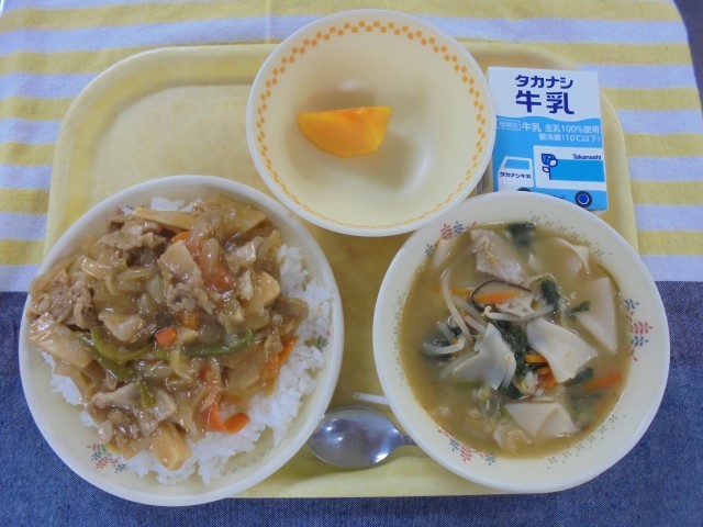 スタミナ丼 ピリ辛ワンタンスープ 果物(柿) 牛乳
