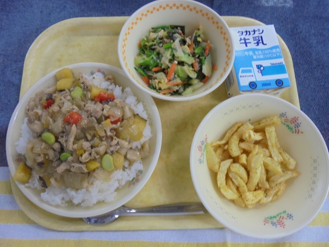 コロコロ根菜ガッパオライス こまツナレモンサラダ じゃが揚げカレー風味 牛乳