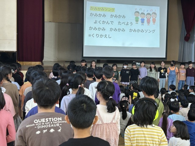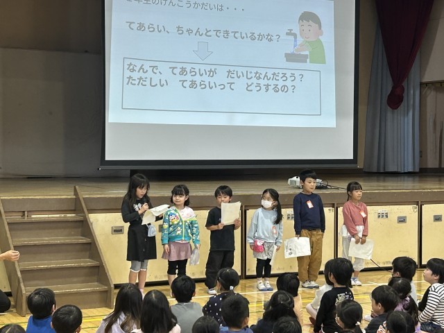 1年生は手洗についての取組を。2年生はよく噛むことの大切さを発表。
