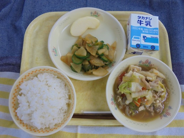 ごはん ひきずり 大根ときゅうりの華風漬け 果物(りんご) 牛乳