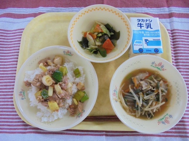 やきとり丼 わかめ入りお浸し もやしのピリ辛スープ 牛乳