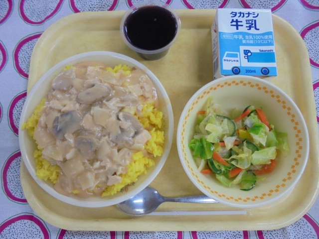 ターメリックライスチキンクリームソースがけ バジルサラダ ぶどうゼリー 牛乳