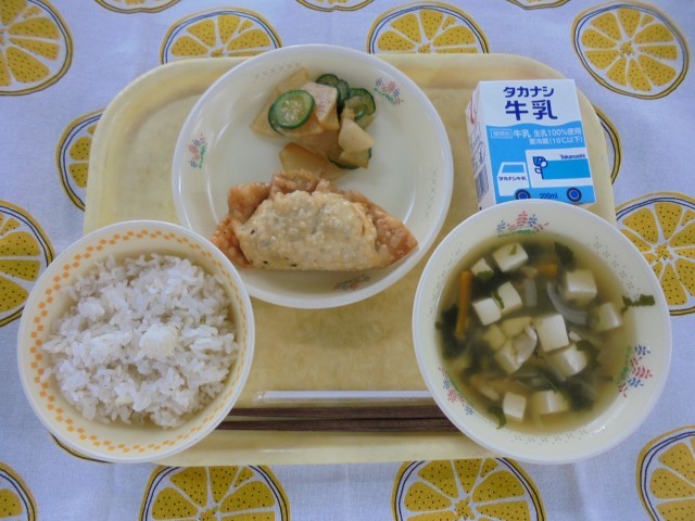 麦入りごはん ジャンボ餃子 大根ときゅうりの華風漬け わかめスープ 牛乳