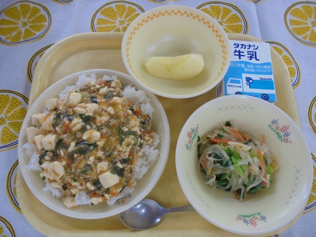 麻婆豆腐丼 春雨サラダ 果物(りんご) 牛乳