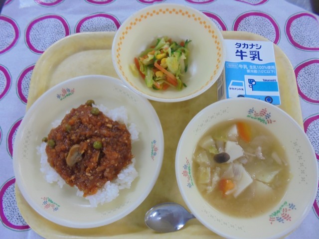 ミートライス さっぱりサラダ 野菜スープ 牛乳