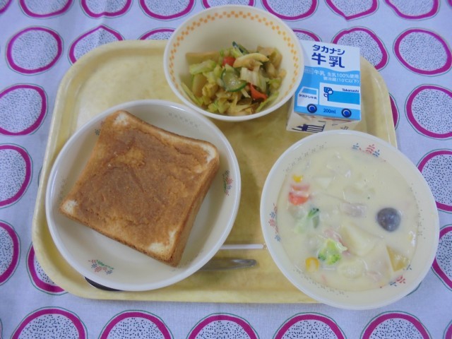 きなこトースト きゃべつと大根のサラダ コーンシチュー 牛乳