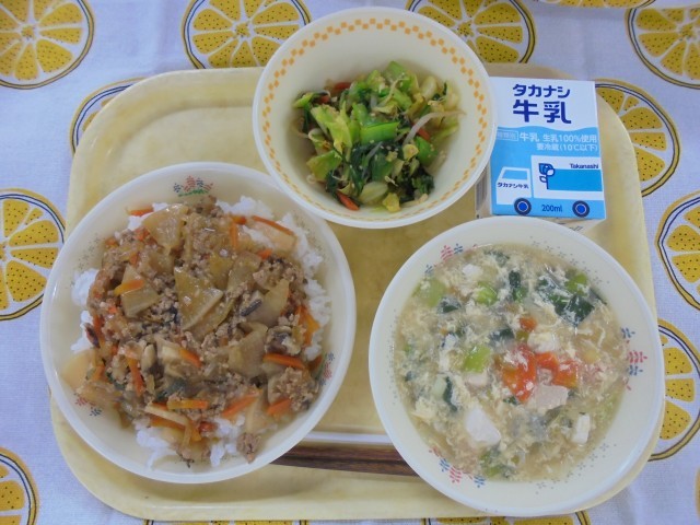 大根のピリ辛丼 野菜のごま和え かきたま汁 牛乳