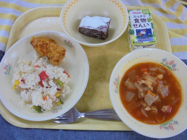カラフルピラフ クリスピーチキン トマトスープ クリスマスココアケーキ 野菜ジュース