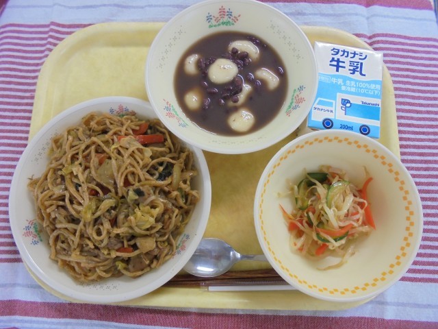 ソース焼きそば ナムル 白玉あずき 牛乳