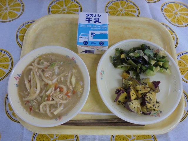 白ごまタンタンうどん わかめの中華サラダ 大学芋 牛乳