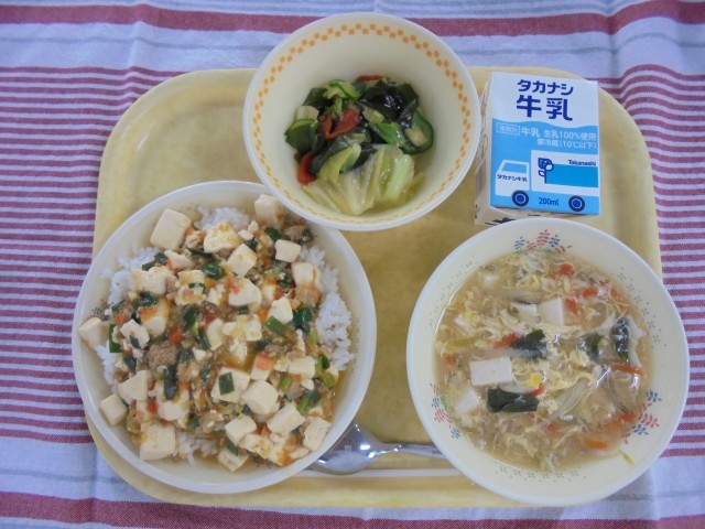 麻婆豆腐丼 わかめの中華サラダ 中華スープ 牛乳