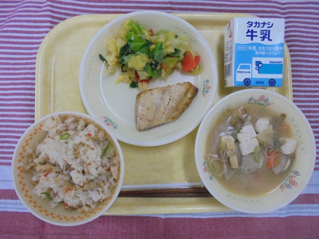こぎつねごはん ほっけのみりん焼き 甘酢和え 豚汁 牛乳
