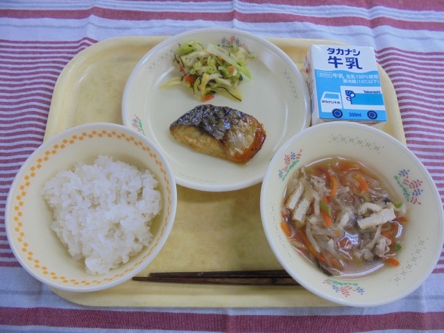 ごはん さばのゆずみそ焼き 野菜のこんぶ和え 沢煮椀 牛乳