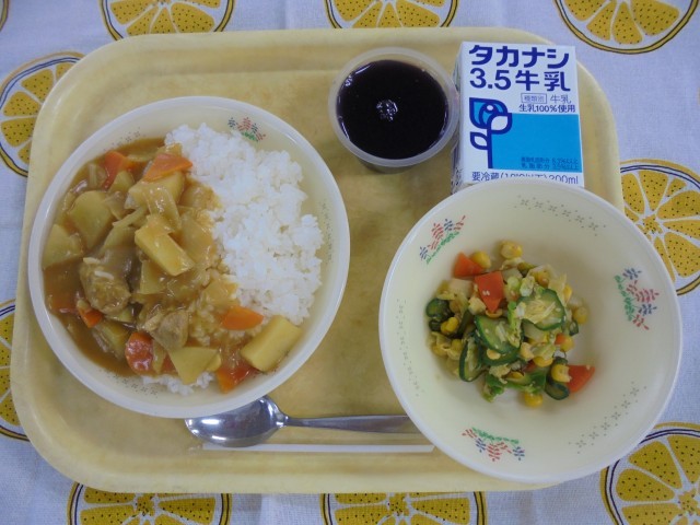 ポークカレーライス きゃべつときゅうりのサラダ ぶどうゼリー 牛乳