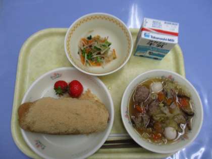 牛乳 きなこ揚げパン 塩ナムル 白菜と肉団子のスープ いちご