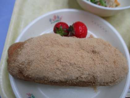 コッペパンを油で揚げてきなこをまぶして作ります。