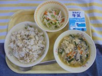 牛乳 ビビンバ 青のりビーンズ 卵入りわかめスープ