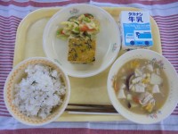 牛乳 鶏ごぼうピラフ 水菜の梅サラダ サンラータン