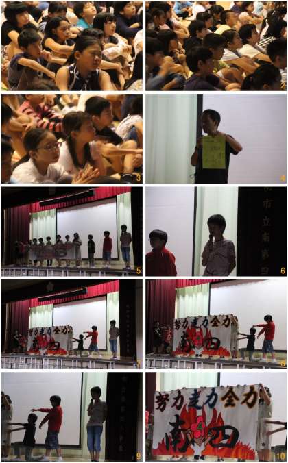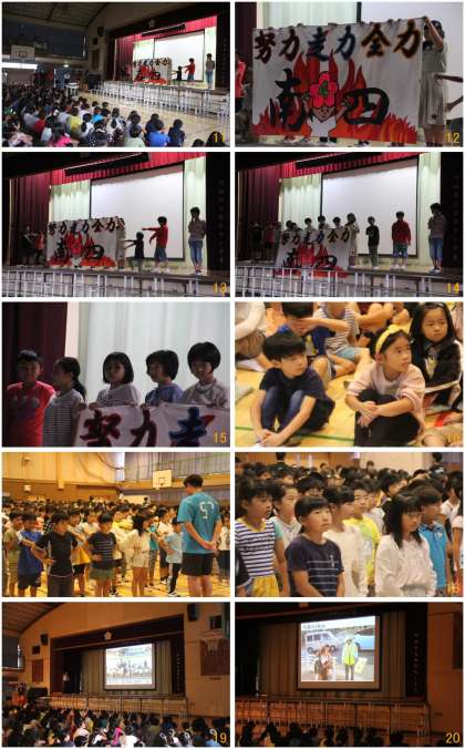 このあと、代表委員会の児童たちがつくった「今年の横断幕:努力、走力、全力」の披露をしました。