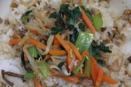 「ビビンバ」は、豚肉・ぜんまい・たけのこ・油揚げをまぜたごはんに野菜のナムルをまぜて食べます。