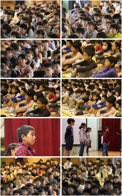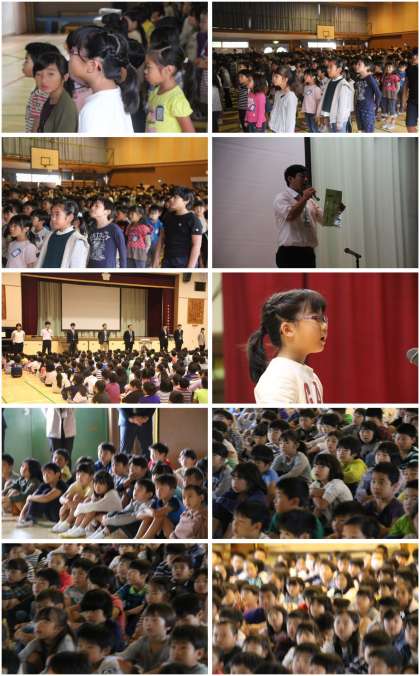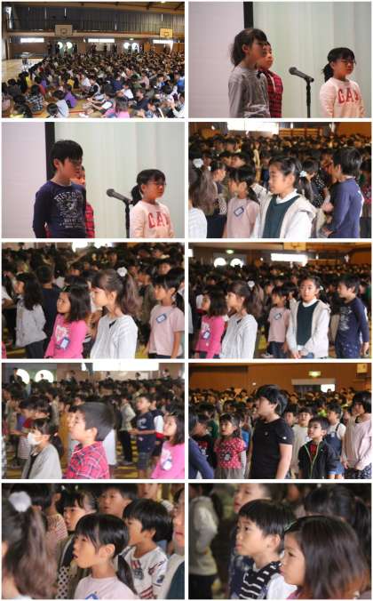 校長線絵師からは、目標をもって取り組むこと、そして、過去の写真を活用した後期のイメージが示されました。始業式のあと、看護当番の先生から今週の目標ナン市−スローガン37番「手を洗い 静かにまっていただきます」の指導をしました。