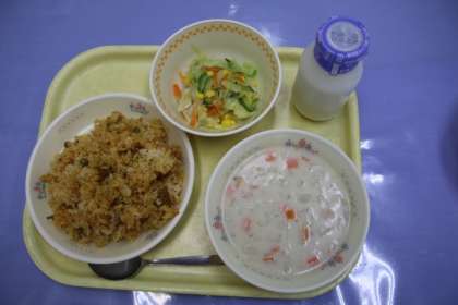 牛乳 スパイシーピラフ お豆のチャウダー コールスローサラダ